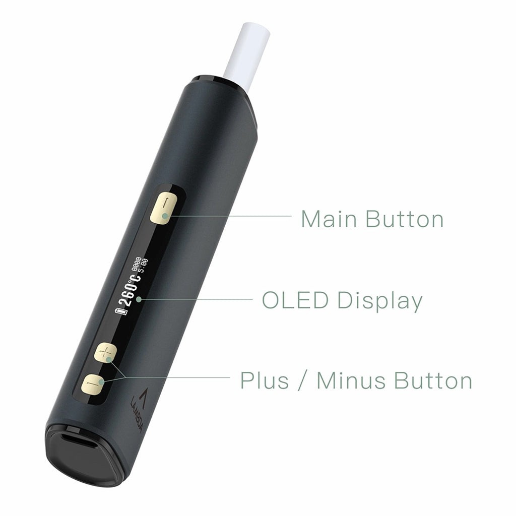 The device features an intuitive control scheme. You can wake the device by pressing the main button. The temperature and time settings are adjusted using the plus (+) and minus (-) buttons located below the OLED screen. The display clearly shows your current settings, battery life, and puff count.